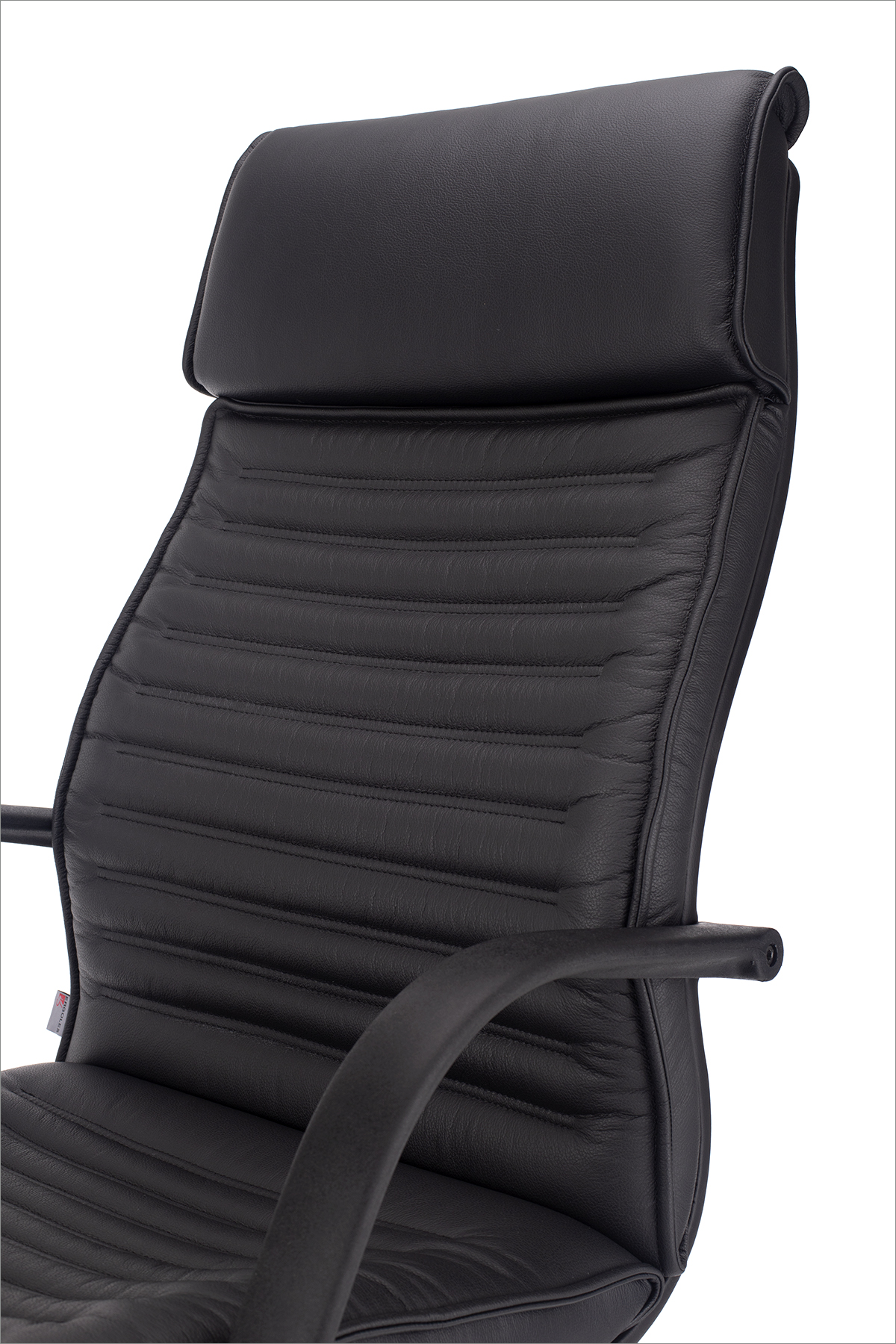 Vrhunski nastavljiv vzglavnik, tapeciran v pravo črno usnje, omogoča individualno prilagoditev glede na višino uporabnika in želeno podporo vratu.