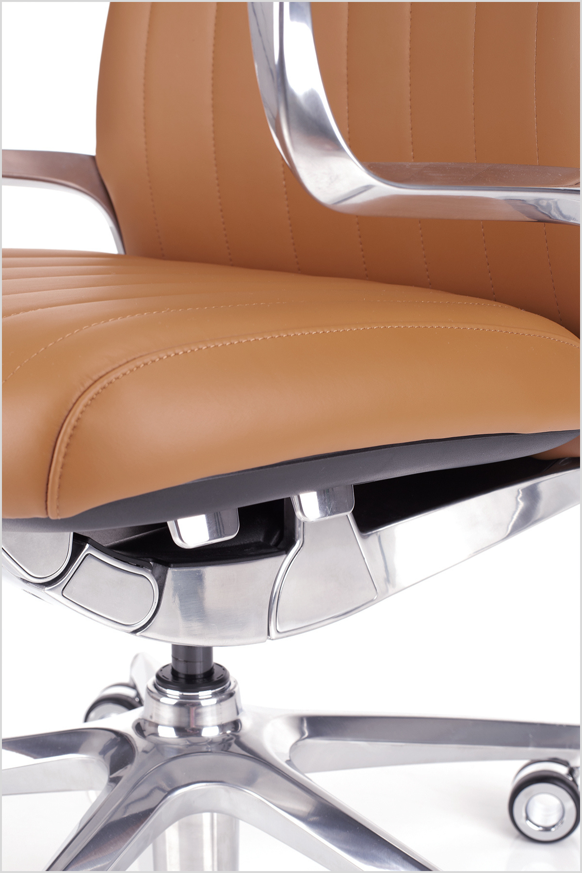 Ta stol ima nepreden sinhron mehanizem z multifuncijsko ročico, ki omogoča enostavno upravljanje višine sedeža, nagib naslona in globino sedeža. Elegantna ročica iz poliranega aluminija zagotavlja občutek kakovosti in prestiža. multifunkcijska rocica